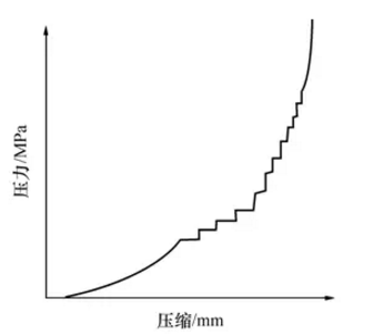 在這個(gè)階段中,耐火磚成型壓力已增加到能使泥料內(nèi)顆粒發(fā)生脆性和彈性變形的程度,所以在壓制時(shí)由于泥料內(nèi)顆粒受壓變形和多角型顆粒的棱角被壓掉,從而使坯體內(nèi)顆粒間的接觸面增加,摩擦阻力增大。因此,使這一階段的壓制特性表現(xiàn)為跳躍式的壓縮變化,即呈階梯形變化曲線;當(dāng)壓制進(jìn)入第三階段時(shí),成型壓力已超過(guò)臨界壓力,即使壓力再升高,坯體幾乎不再被壓縮。下圖的這種耐火磚對(duì)模具的要求和壓力機(jī)的選擇都要求很高。